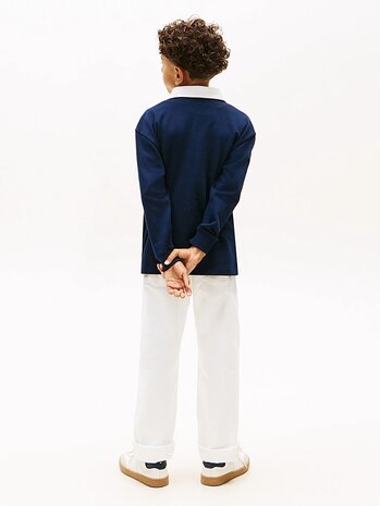 Tommy Hilfiger old school flag serie, wie kent hem niet en heeft er vroeger zelf niet ooit van van gehad?? Deze gave rugby is een must have voor de fashionble kids. 100% katoen Navy