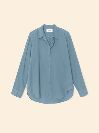 Typisch essentieel item is deze Xirena shirt. De Beau van Xirena is een essentiële basic. Het Beau Shirt is gemaakt van onze klassieke lichtgewicht geweven katoenen popelin voor een doorleefde look en feel. Het heeft een op herenkleding geïnspireerde vorm en is seizoen na seizoen een must-have. Steel Blue